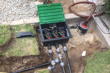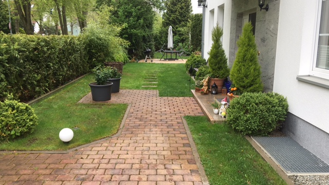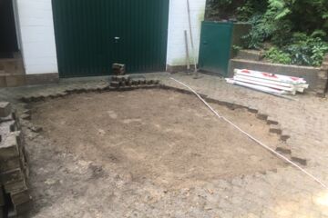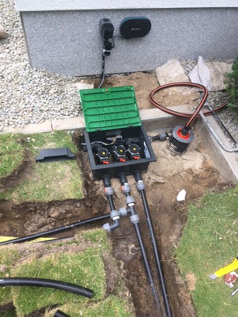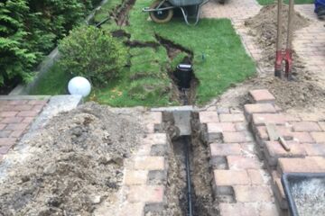 Einbau von Gartenbewässerungsanlagen und Wiederherstellung der Pflasterflächen.