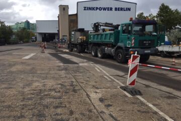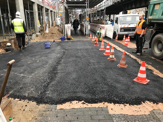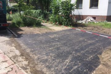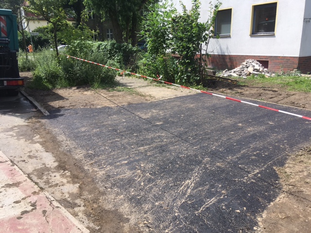 Herstellen von Baustellenüberfahrten (provisorische Gehwegüberfahrten) und Baustraßen aus Recycling und bituminösem Mischgut, um vorhandene Gehwege und ihre darin befindlichen Leitungen gegen hohe Drücke der Verkehrslasten z.B. beim Bau von Einfamilienhäuser, Industriebauten usw. zu schützen.